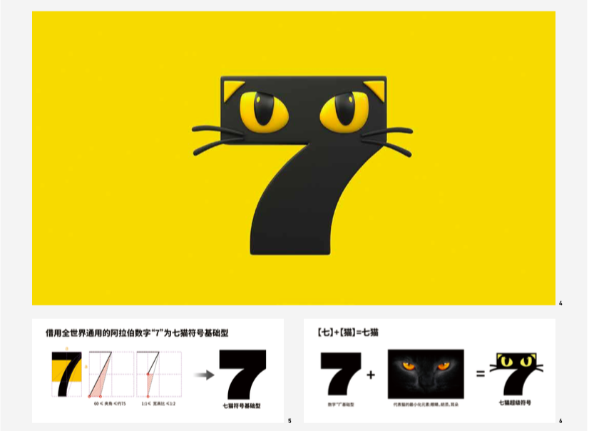 We leverage the inherent dramatic nature of the Seven-Cat brand: Seven-Cat = 7 + Cat. We selected the universally recognized Arabic numeral "7" with a history of over 2,500 years, as the basic form of the logo design. After studying various cats from around the world, we distilled three minimal yet representative elements of cats: whiskers, eyes, and ears. Finally, these elements were combined to form the brand's Super Sign, featuring a large-eyed Seven-Cat.